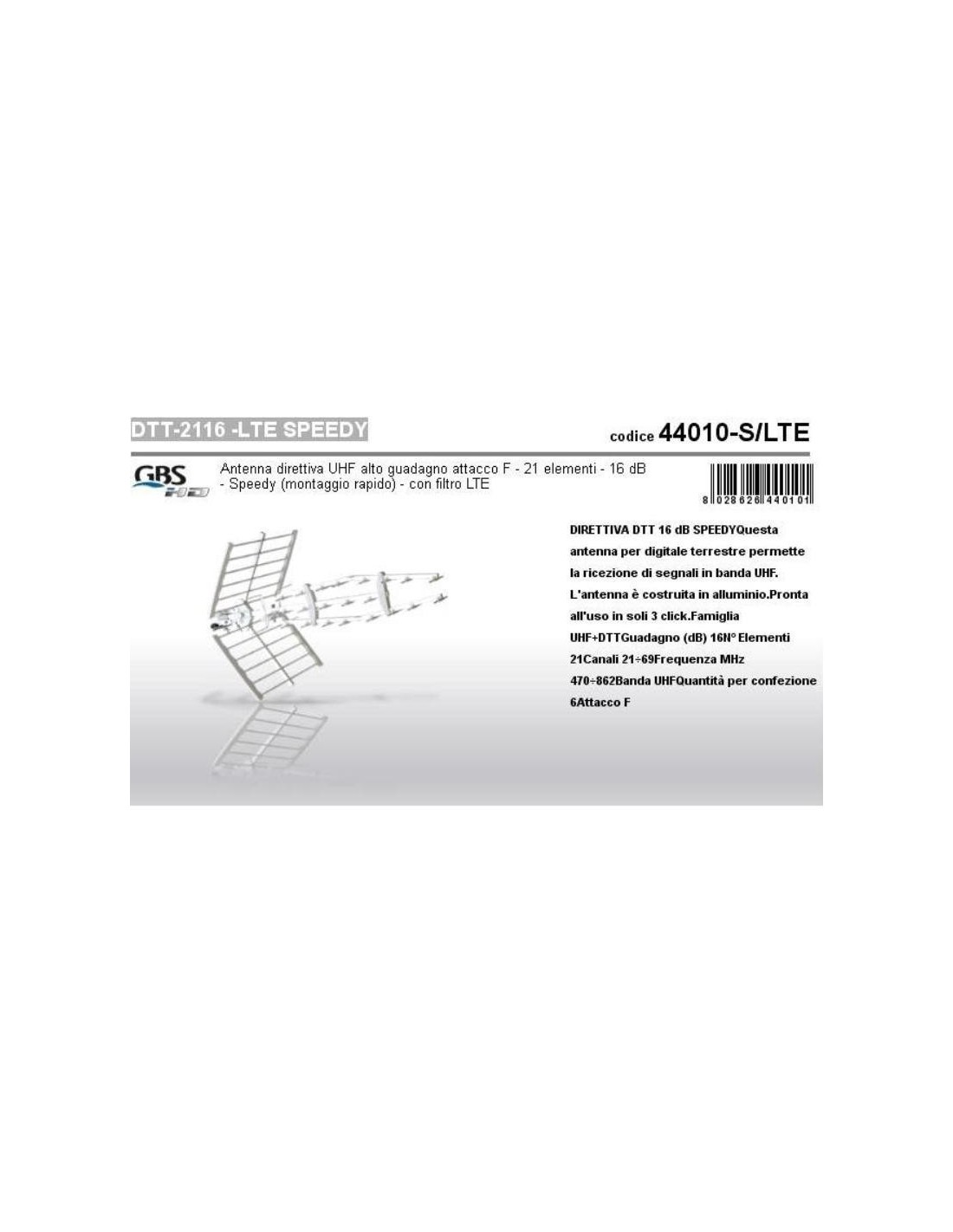Antenna direttiva digitale terrestre UHF 16 dB di guadagno - attacco F - 21 elementi -  Speedy (montaggio rapido) - con filtro LTE.