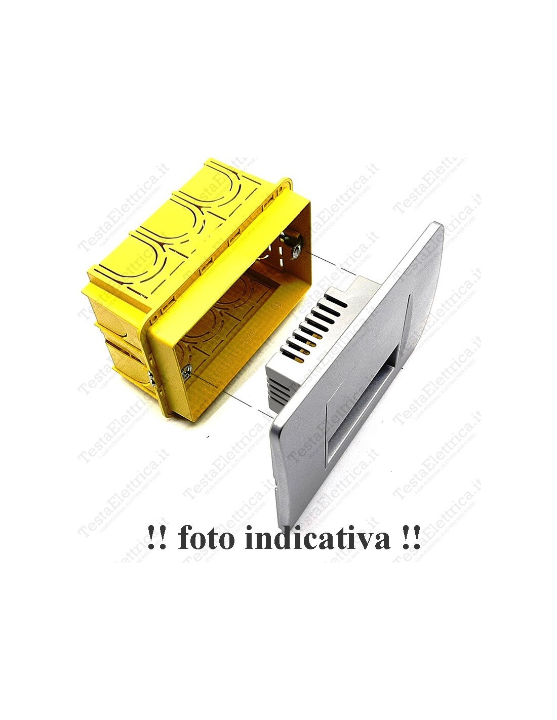 Non necessita di altro, ne di alcun adattatore ne di nessun altro supporto o placca, monta direttamente sulla scatola a muro avvitando semplicemente le viti laterali (incluse) e collegando il morsetto alla rete elettrica 220V*.
