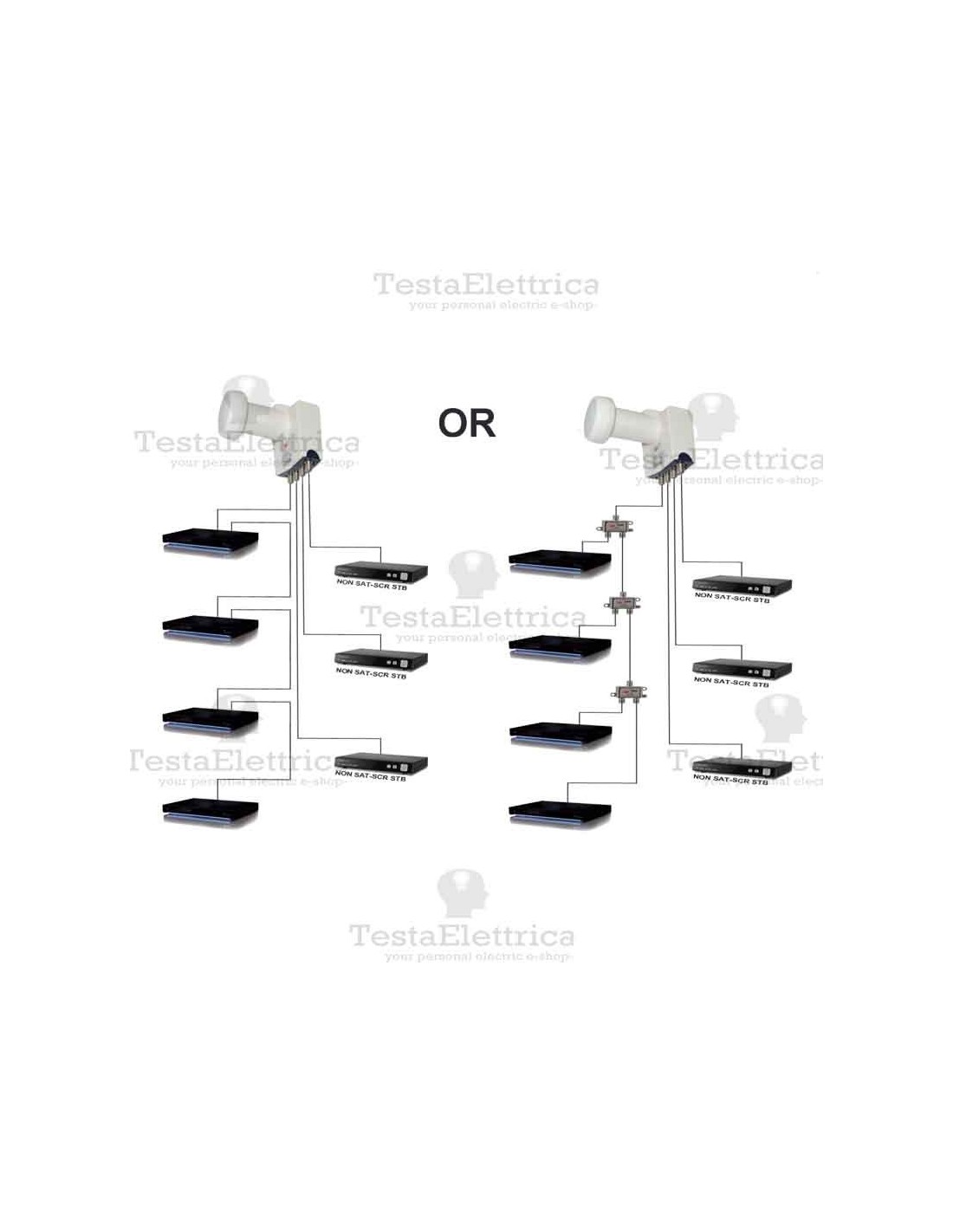 Questo tipo di LNB è adatto a poter distribuire su un unico cavo il segnale per quattro decoder che abbiano installato il soft ware SCR. Inoltre possiede un uscita Legacy per la connessione di un decoder sprovvisto di SCR.