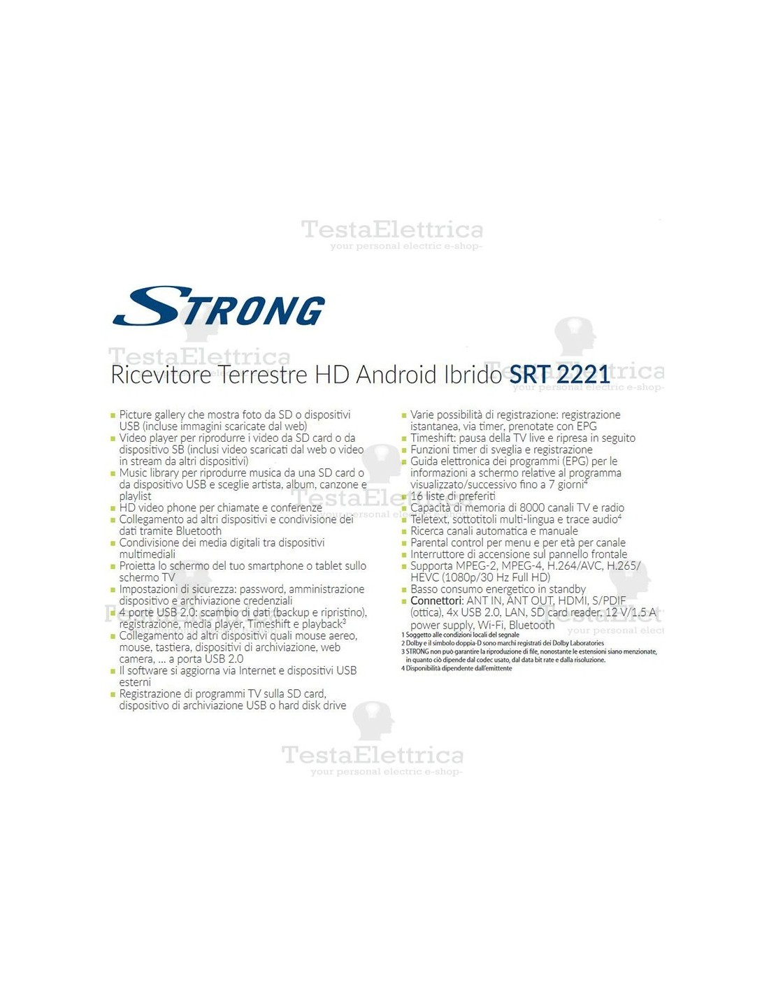 Con l’SRT 2221 puoi godere di video, musica, foto, installare giochi ed applicazioni, navigare in Internet via LAN o Wi-Fi, condividere contenuti sui social media e molto altro! Porta un sacco di divertimento e di funzionalità. Inoltre, puoi anche vedere programmi Free-to-Air in HD perchè l’SRT 2221 incorpora un tuner DVB-T2. Funzione di registrazione USB , Timeshift , liste di favoriti e molti altri extra rendono questo piccolo Android box semplicemente perfetto.