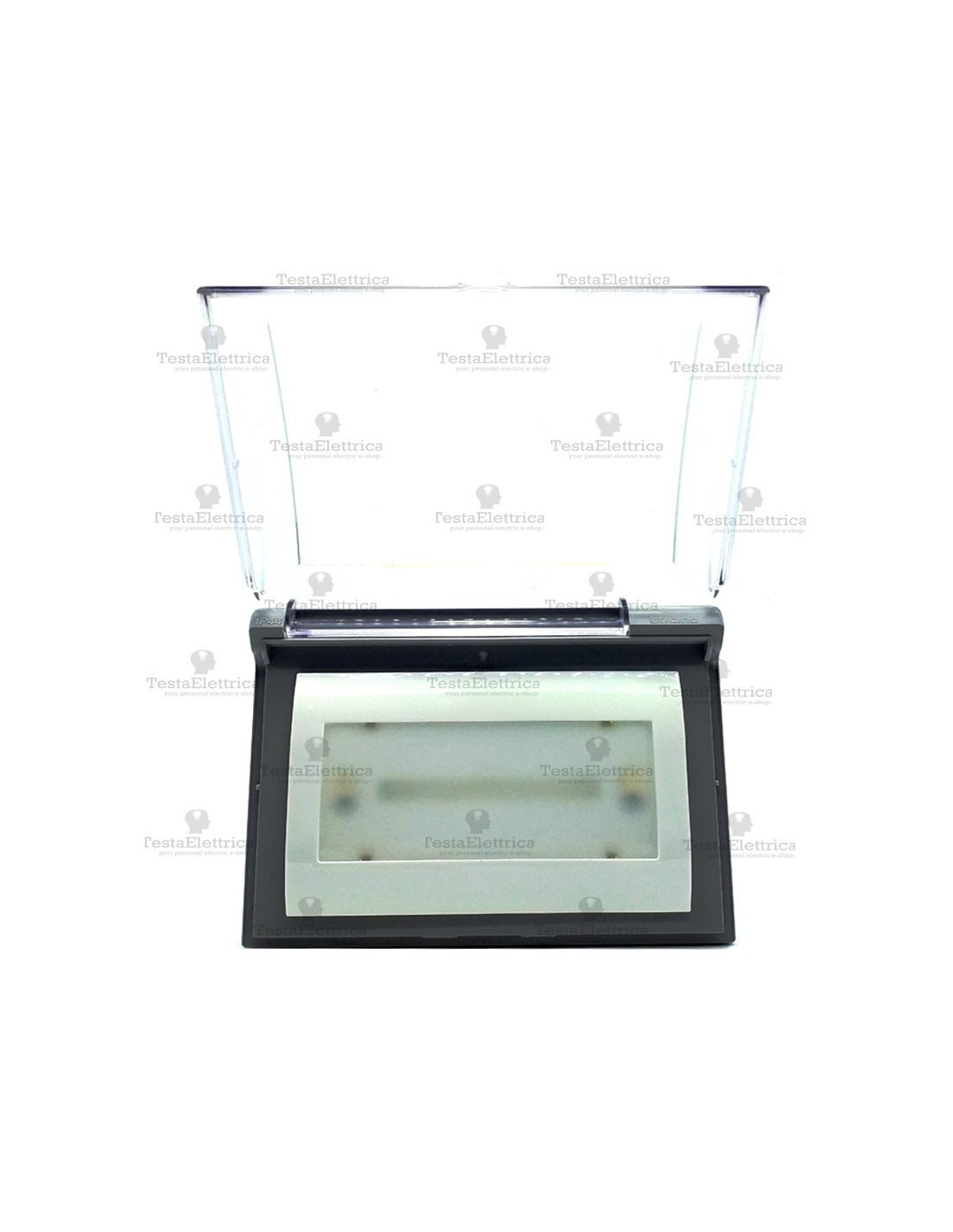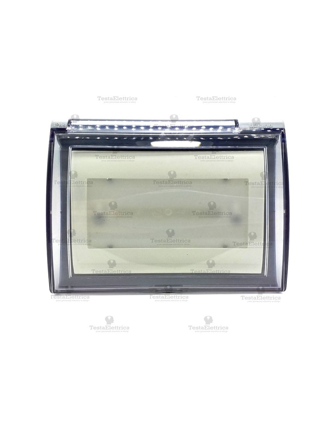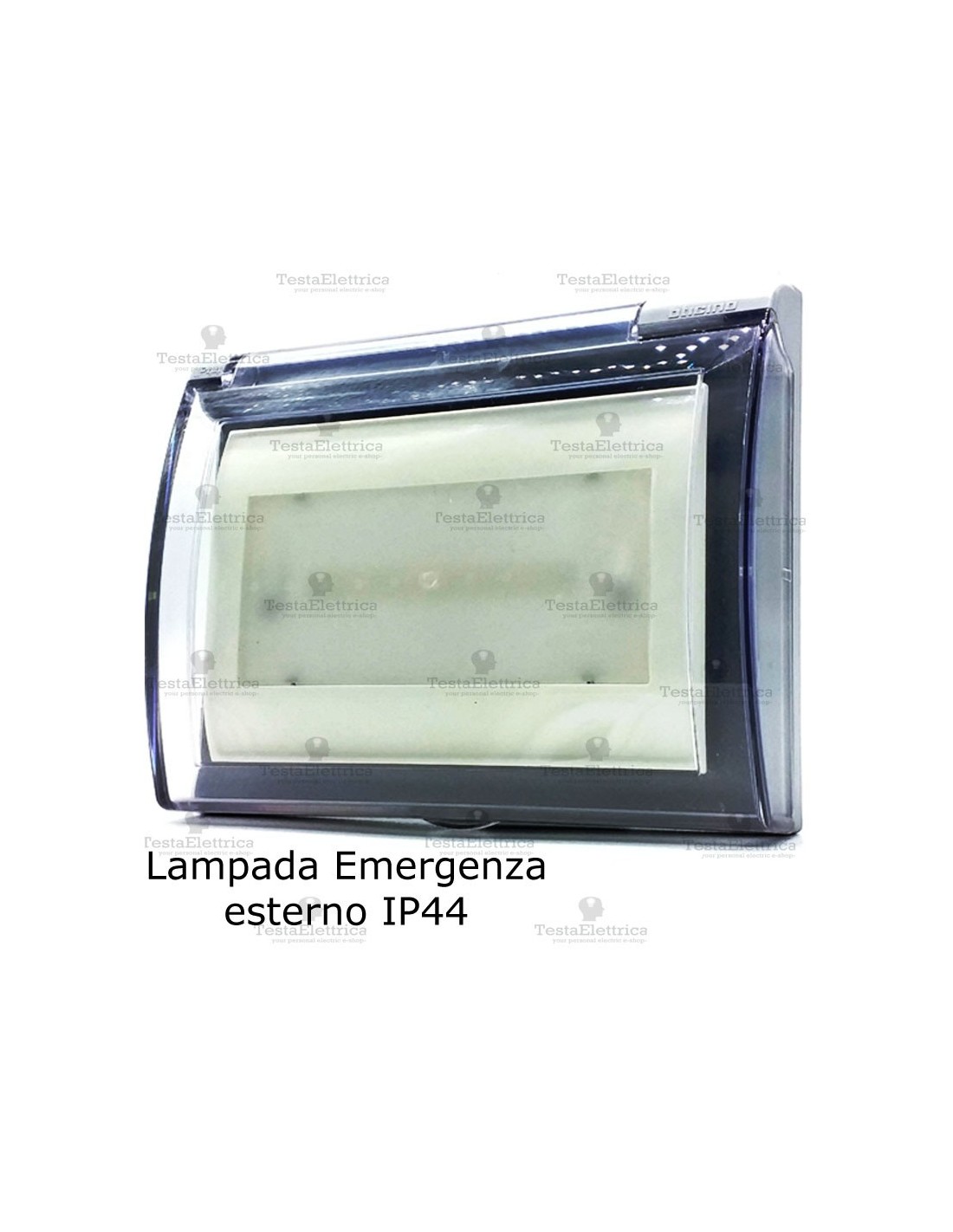 In impianti civili residenziali e professionali, modulo per l' illuminazione d' emergenza con montaggio ad innesto diretto su cassetta da parete a 3 moduli (non inclusa), completa di custodia protettiva anti pioggia; ideale l' installazione in ambienti esterni e umidi o a contatto con l' acqua (grado IP44).