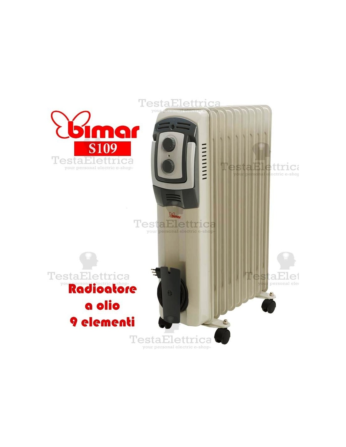 Termosifone ad olio a 11 elementi con termostato e sicurezza antiribaltamento.