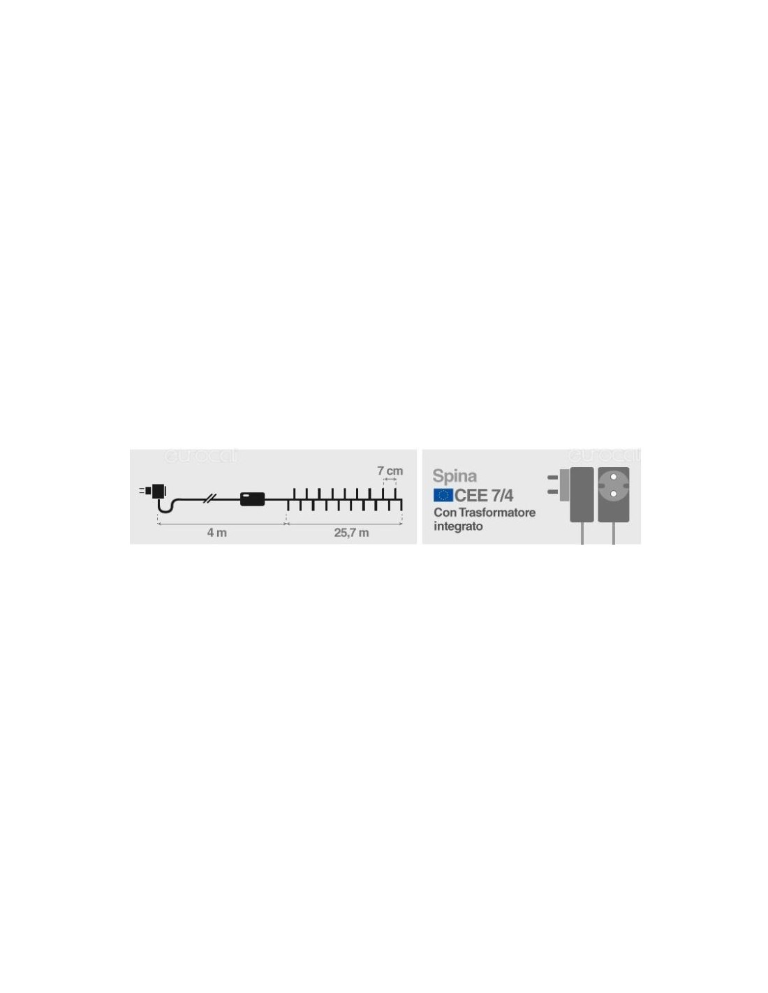 Cavo di colore verde con lunghezza totale di 29,7 m. Catena di luci lunga 25,7 m, con distanza tra i bulbi di 7 cm. Cavo di collegamento elettrico lungo 4 m. Alimentazione in ingresso: 220~240. Tensione in uscita: 30V. Spina di tipo Schuko (CEE 7/4) con trasformatore integrato.