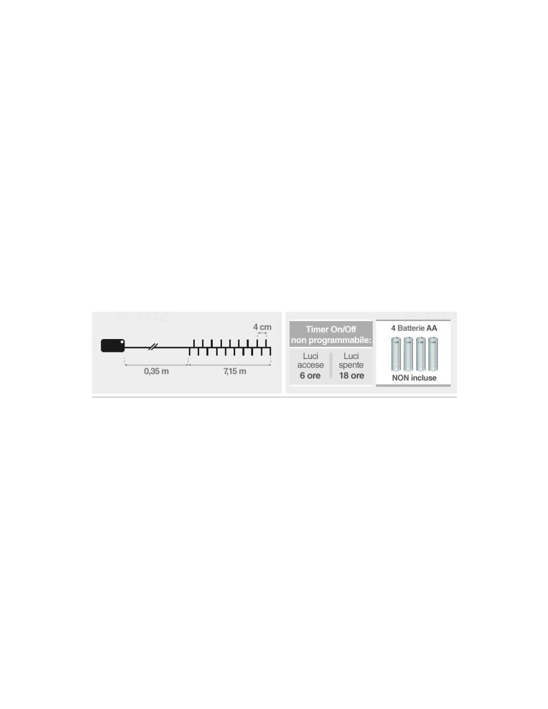 Cavo di colore verde con lunghezza totale di 7,5 m. Catena di luci lunga 7,15 m fittamente illuminata, con distanza tra i bulbi di 4 cm. Cavo di collegamento al controller lungo 0,35 m.Alimentazione tramite 4 batterie Stilo AA (non incluse), che forniscono circa 15 giorni di autonomia con la configurazione a 6 ore luci accese / 18 ore luci spente.