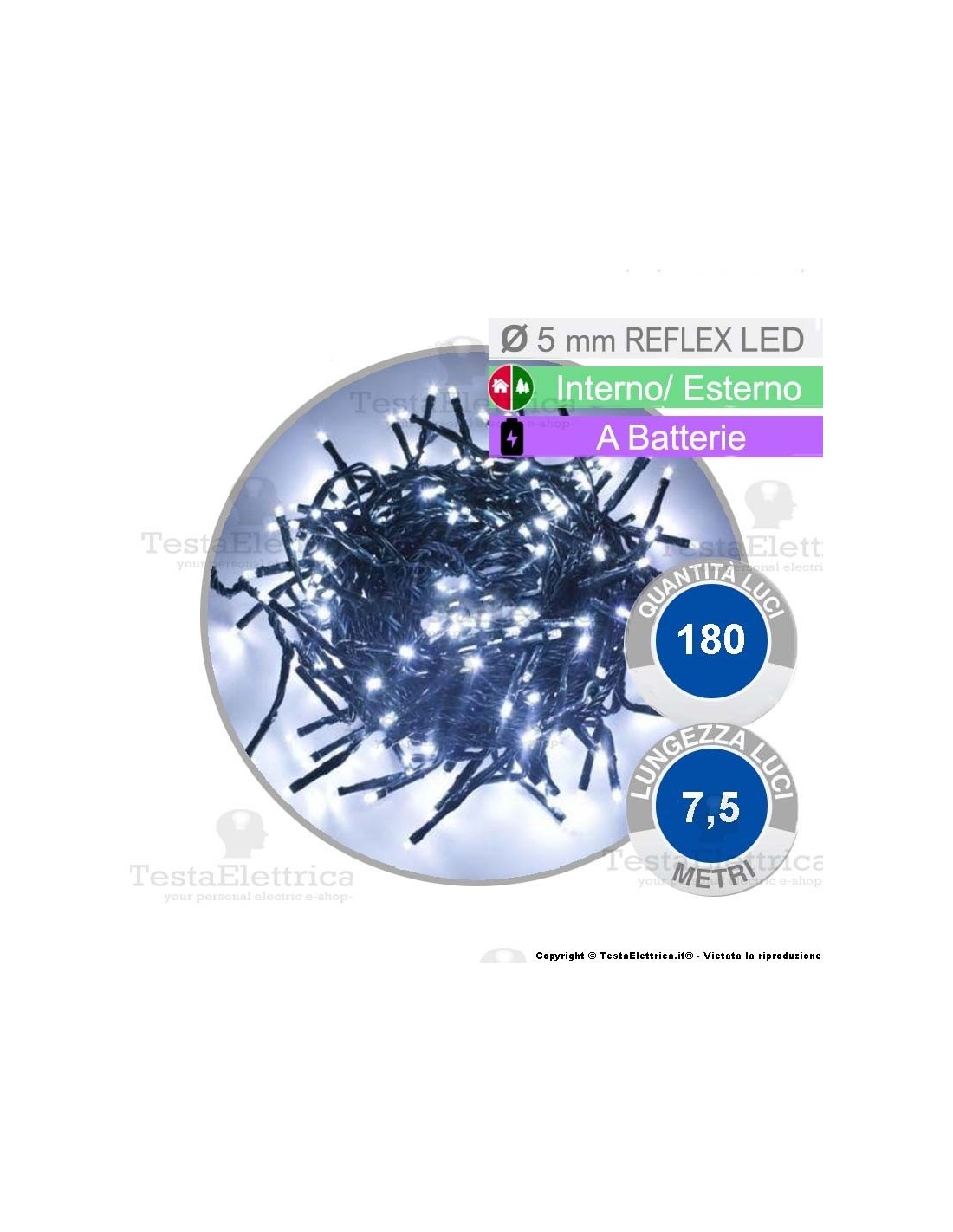 Catena luminosa natalizia a batterie, dotata di controller Memory®, composta da 180 REFLEX® Led diametro 5 mm, distribuiti su una lunghezza complessiva di 7,15 metri.