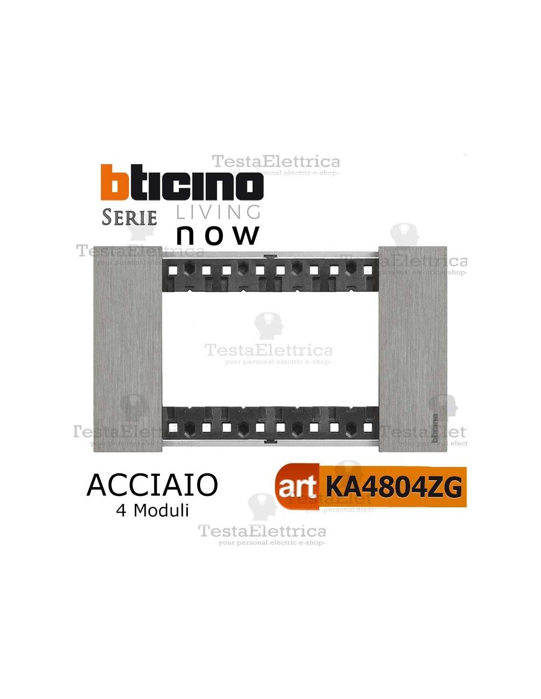 In impianti elettrici civili e professionali, elemento estetico di colore acciaio a completamento di punto luce, montaggio diretto su supporto K4704, per l' innesto esclusivo di moduli e cover bticino living now.