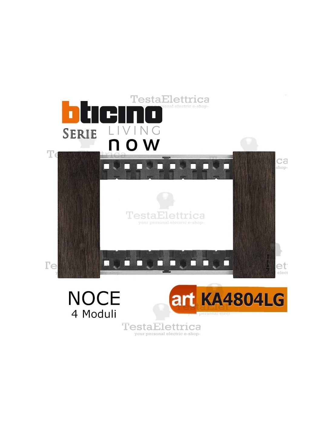 In impianti elettrici civili e professionali, elemento estetico di colore noce a completamento di punto luce, montaggio diretto su supporto K4704, per l' innesto esclusivo di moduli e cover bticino living now.