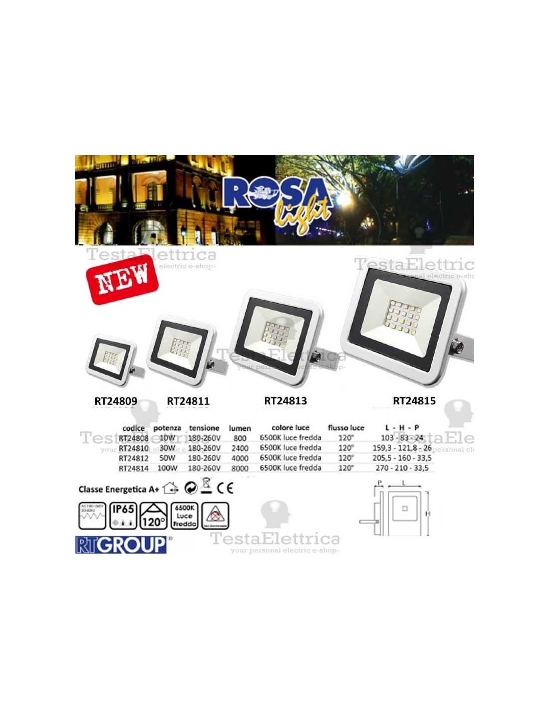 Struttura in pressofusione, cavo di alimentazione preinstallato, chip led SMD ad elevata efficienza luminosa, vetro temperato antiurto e staffa orientabile.