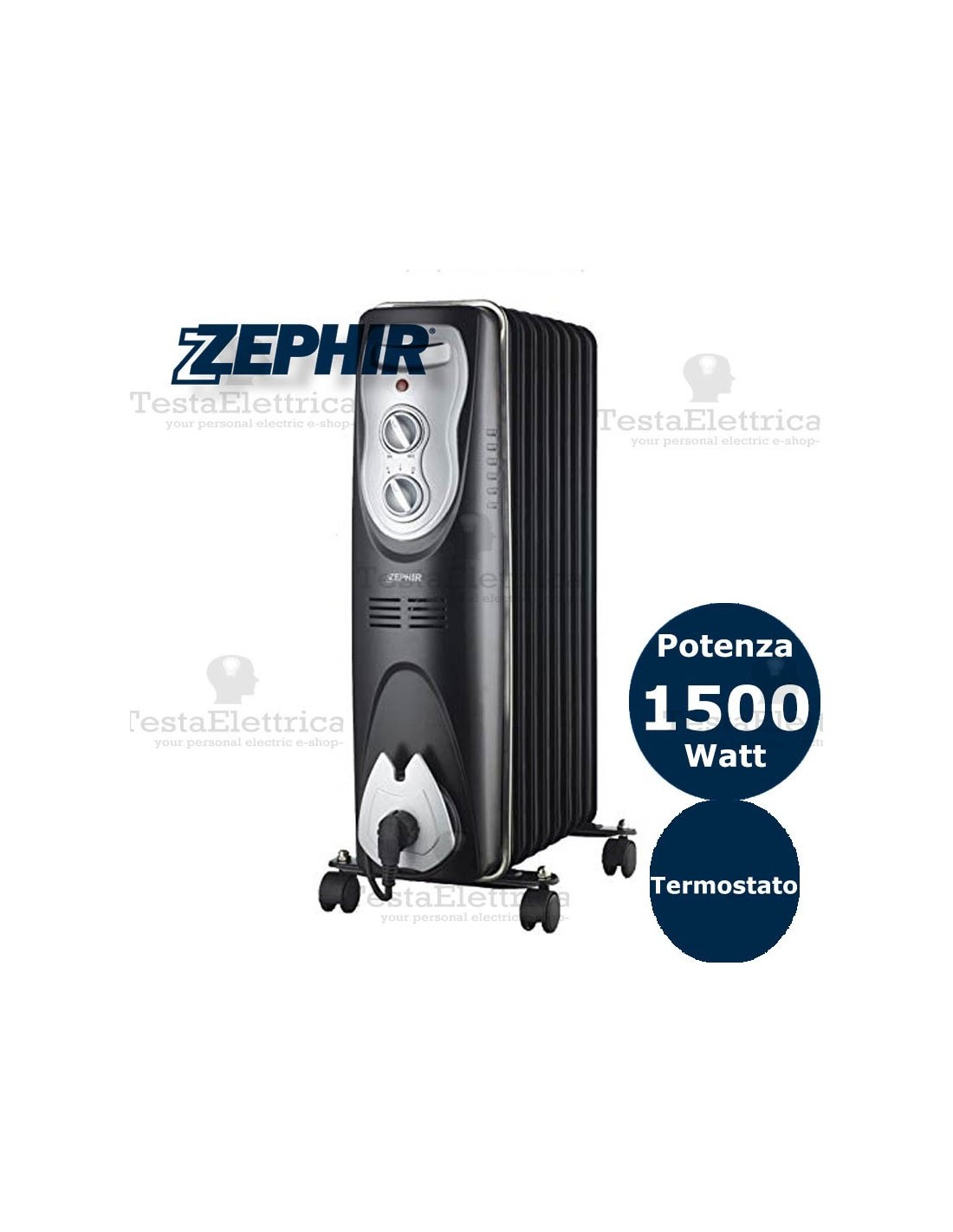 Convenzione ad alta efficienza grazie ai 7 elementi 160x600mm con 6 canali di circolazione olio; Potenze regolabili con selettore: 0/600/900W/1500W; Termostato ambiente; Segnalatore luminosio; Interruttore anti-ribaltamento; Struttura in metallo, facile da spostare con 4 ruote e maniglia a scomparsa; Staffa avvolgicavo; 220-240V ~ 50Hz 1500W;