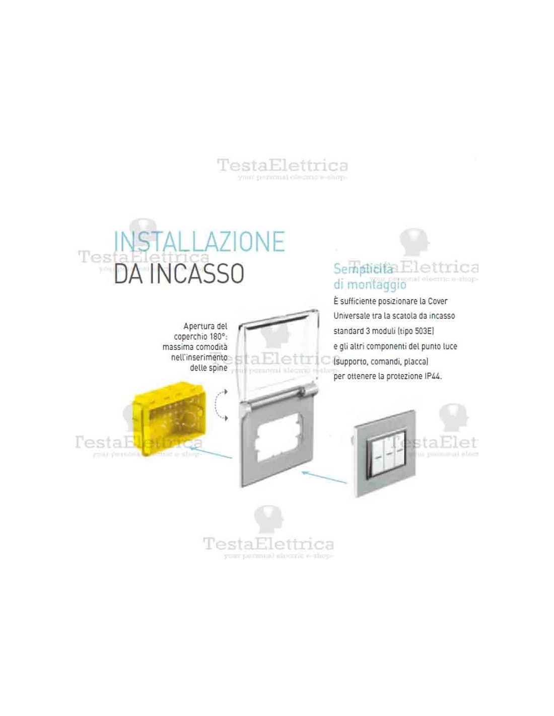 Si installa su scatole da incasso standard 3 moduli tipo 503E.