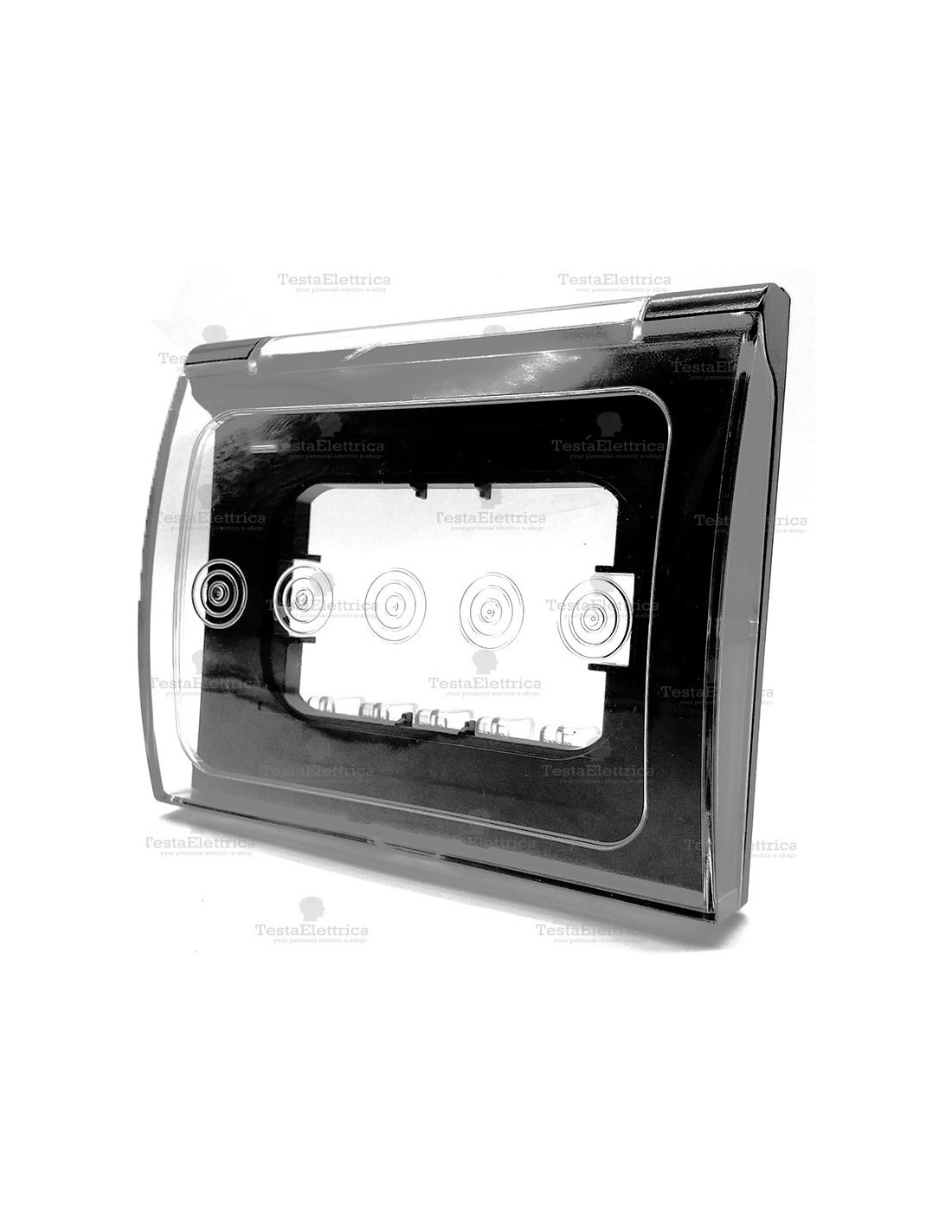 Coperchio universale con portello da completare con supporti, moduli e placche, di qualunque serie.