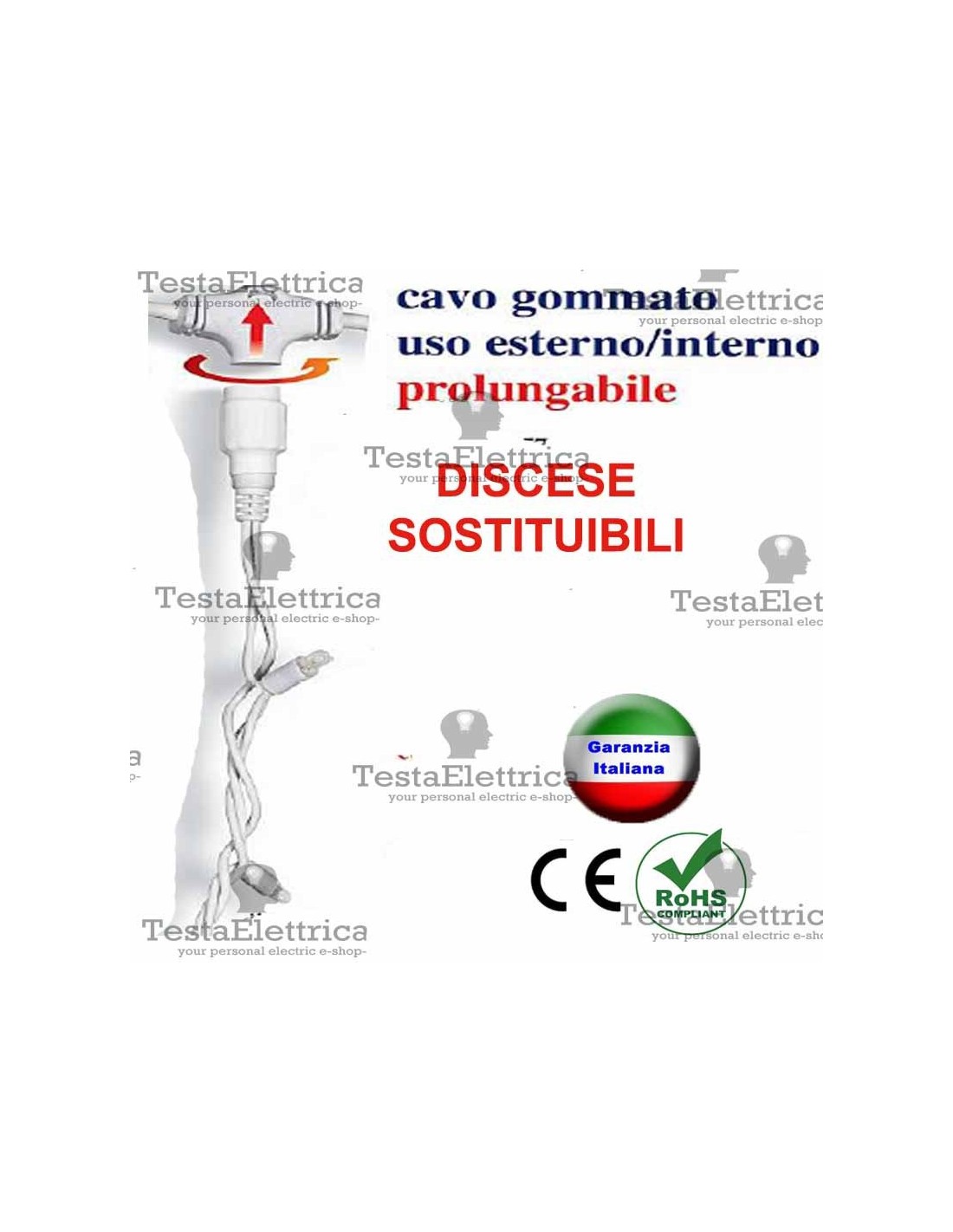 pendenti in cavo bianco e led bianco ghiaccio o bianco caldo per un totale di 250 led, su una lunghezza di 1,50 metri prolungabili fino a 5 per un massimo di 1250 led; ogni singolo pendente è sostituibile