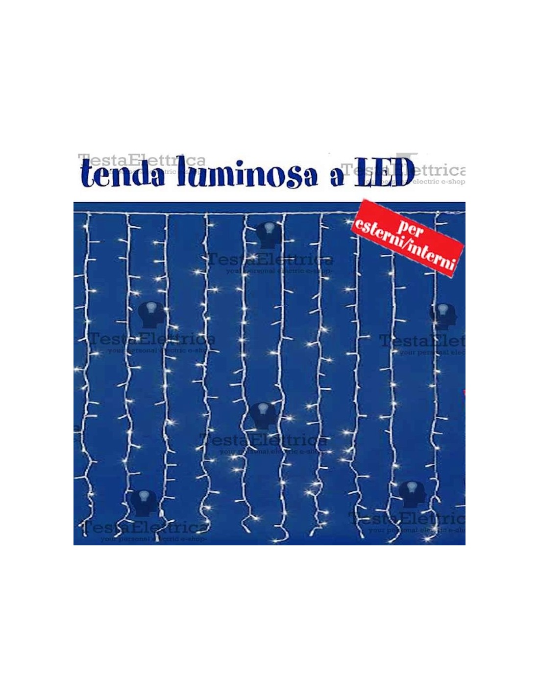 Tenda luminosa realizzata in cavo bianco su 24 pendenti , illuminati da 21 Led Bianco Ghiaccio ognuno, per un totale di 504 Led; controller giochi luce incluso.