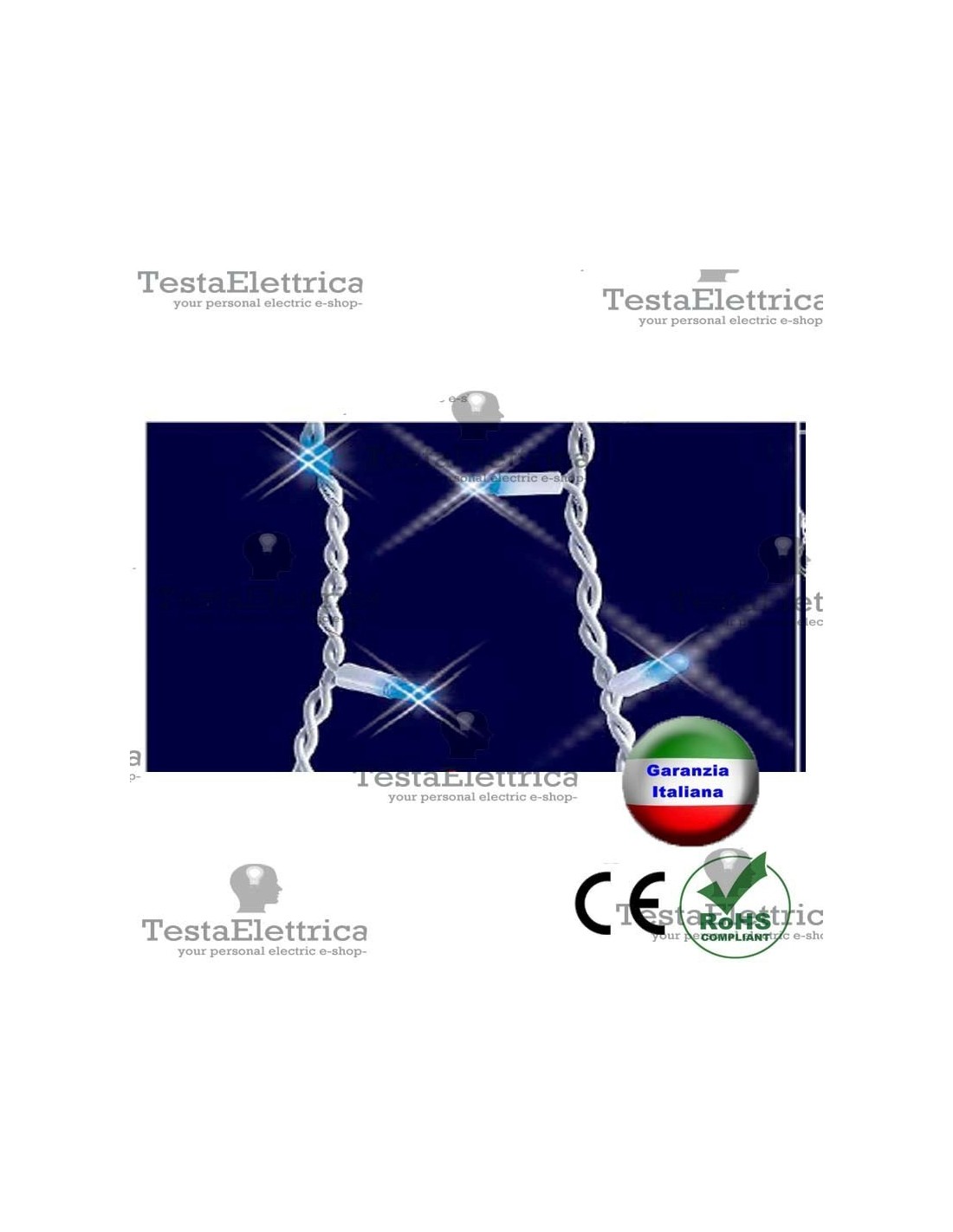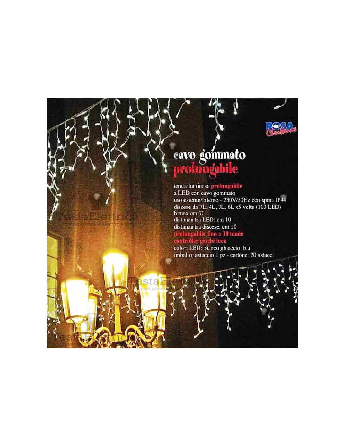 Le decorazioni consistono in 5 serie da 4  discese illuminate da 7-4-3-6 luci led su cavo bianco, per un totale di 100 led distribuiti su una lunghezza complessiva di 2 metri; serie prolungabile fino a 10 pezzi per un totale di 1000 led su 20 metri, comandabile anche da un solo controller giochi luce (incluso).