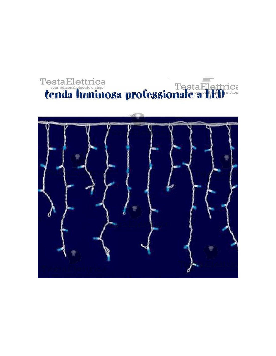 5 serie di 4 pendenti in cavo bianco da 7-4-3-6 led bianco ghiaccio/ caldo rispettivamente per un totale di 100 led su una lunghezza di 2 mt; prolungabile fino a 10 tende, 20 mt per un totale di 1000 led