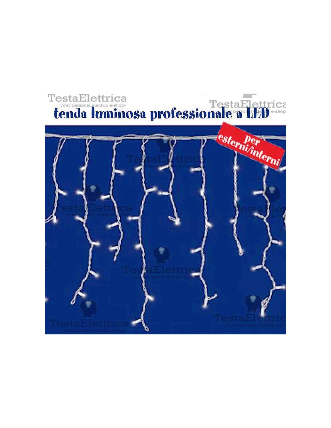 5 serie di 4 pendenti in cavo bianco da 7-4-3-6 led bianco ghiaccio/ caldo rispettivamente per un totale di 100 led su una lunghezza di 2 mt; prolungabile fino a 10 tende, 20 mt per un totale di 1000 led