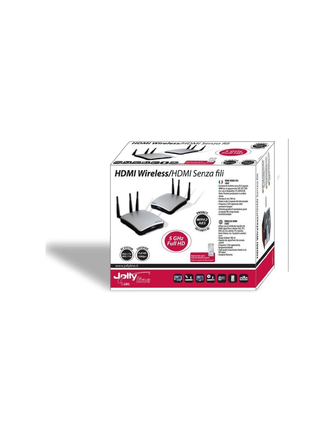 Questo dispositivo permette di trasmettere un segnale audio, video, o entrambi, da una sorgente (decoder SKY, mediaset premium, PC, Play station, XBOX, HI-FI, DVD, Lettori Blu-ray, ecc..) ad un apparecchio ricevente ( TV, monitor, videoproiettore, home theatre ecc), in alta definizione e senza fili.