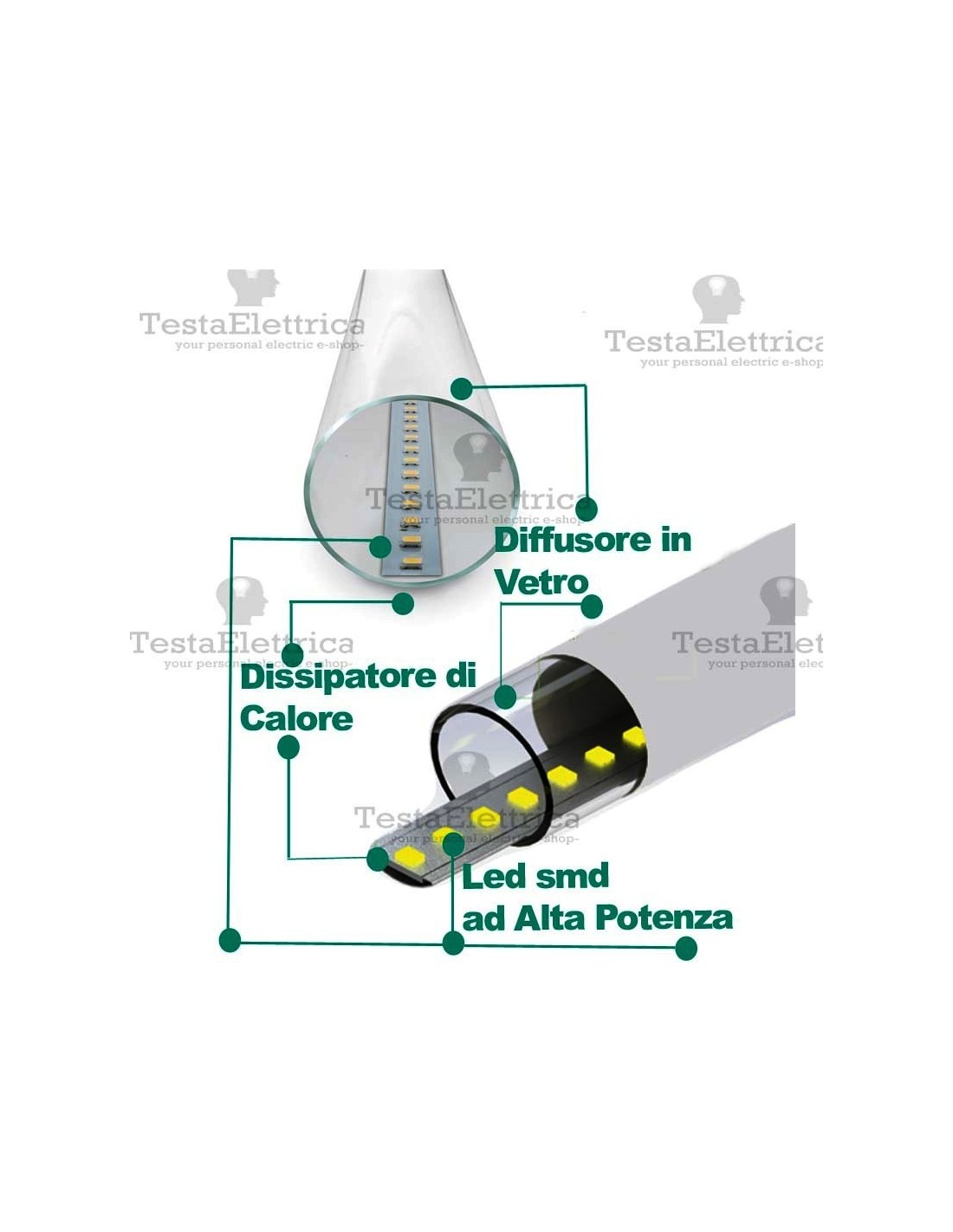 Lampada a  led tipo fluorescente lineare realizzato in cover completamente in vetro, (simula perfettamente le vecchie lampade omologhe), una striscia di LED epistar SMD ultraluminosi su dissipatore in alluminio, e diffusore opalino per un' aspetto di illuminazione uniforme.